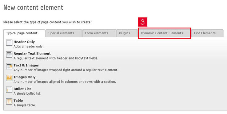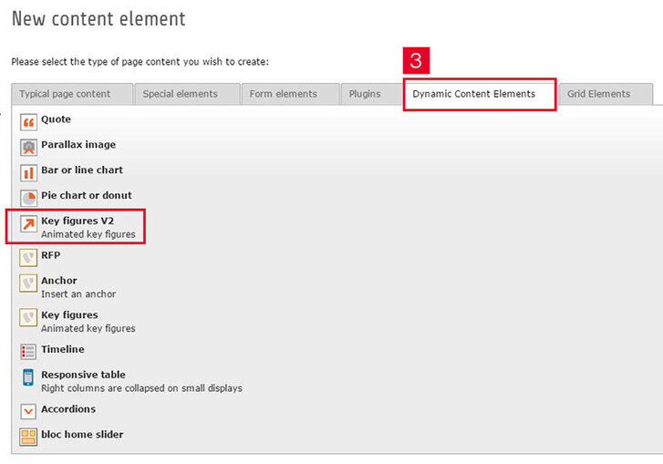 . Click on the tab "Dynamic Content Elements" and select then "Key Figures V2". You reach the content properties screen and have to define it.
